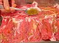 タレ、香草の盛り合わせと一緒に食卓に運ぶ。