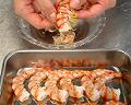 エビは頭と背ワタを取り除いて、色が変わる程度に塩ゆでし、冷水に落とす。水気を拭いて殻を剥く。