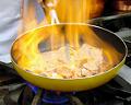 フライパンにサラダ油を入れて強火で熱し、豚肉を手早く炒め、エビを加えてネップ・モイでフランベーする。