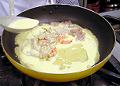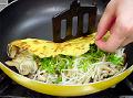 バイン・セオの生地を底からよく混ぜ、約125 mlを流し入れる。フライパンを傾けて、薄く広げる。