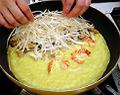 手前半分に蒸した緑豆を散らし、その上から玉ねぎ、きのこ、水気を切ったもやしを重ねる。