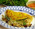 各自でレタスの上に適量のバイン・セオの皮と具をのせ、好みのハーブやタレの中のにんじんと大根をのせる。これらを筒状に巻き、タレに浸して、手で食べる。