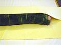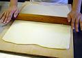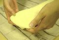 左右の腕に平均に力を入れ、上下に伸ばす。時々、表面を手のひらで触り、生地の厚みをみて調整する。