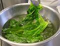 ほうれん草は茎付きで塩ゆでにし、冷水に落とす。
