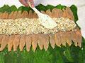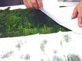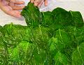 茎を切り取り、ラップの上に少しずつ重ねながら広げる(約40 cm角の正方形)。