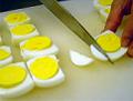 固ゆで卵は殻をむいて縦半分に切り分け、両端の白身の部分は切り落として粗く刻む。