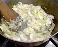 鍋にバターを溶かし、玉ねぎのみじん切りを入れ、しんなりとするまで炒める。次にマッシュルームを加えて炒め、塩と黒こしょうで下味をつける。