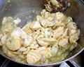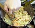 塩と黒こしょうをまぶした鮭を加え、表面が白くなれば白ワインを加えて蓋をし、蒸し煮にする。