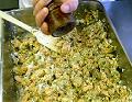 バターライスを加えて木べらで混ぜながらサーモンを粗く崩し、火を止めて中身をバットに移す。