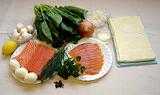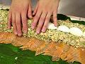 ほうれん草の上にスモークサーモンを少しずつ重ねながら広げ、その中央に半量の詰め物を約10 cm幅で重ねるように広げる。