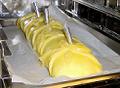 パイ生地の中央に棒状に形作った詰め物をのせてきれいに包み込む。余分な生地は切り取り、合わせ目はハケで水を塗って重ねる。パイ生地の合わせ目が下になるように置く。