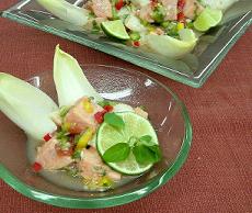 | 「セヴィッチェ」とは、メキシコに限らず中南米の国々でよく作られている料理の一つです。日本料理風に伝えるのであれば、「新鮮な魚介類のキズシ」と言えばよいでしょうか?食べやすく切り分けた魚介類をたっぷりのライムやレモンジュースに漬け込み、白く変色してから野菜やオリーブ油などを加えて調味した前菜としての料理です。 |
