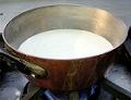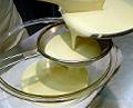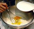 ボウルの中央に卵、プレーンヨーグルト、溶かしバターを入れ、泡立て器で混ぜ続けながら温めた牛乳を少しずつ加える。