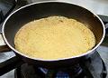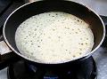 生地を少量落とし、軽くジューという音がする程度に温めてからフライパン全体に生地を薄く流す。