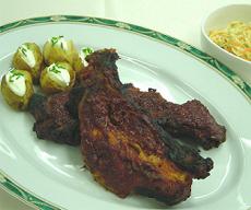 | アメリカ南東部の人々に限らず、多くの方々に愛され続けている「豚スペアリブのバーベキュー」です。まずは骨付きの肉に塩、こしょうをまぶしてしっかりとすりこみ、水から肉が柔らかくなるまでゆっくりとボイルします。その間にトマトとリンゴをベースにした甘酸っぱいバーベキュー・ソースを作ります。好みでタバスコを加え、辛味を調整します。あとは肉にソースをまぶしながら、こんがりとじっくり焼き上げればバーベキューの出来上がりです。付け合せにはベイクド・ポテトとコールスローを添えていますが、他にピクルスやグリルにした果物を添えるのもいいですね。休日に多くの仲間たちが集まれば楽しいパーティーメニューの一つになることでしょう。 |