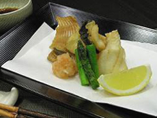 - うろこと内臓を取り除いたかれいを、頭をつけたまま五枚おろしにし、身と、頭がついたままの骨を別々に揚げる。