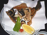 - うろこと内臓を取り除いたかれいに、粉をまぶして姿のまま揚げる。