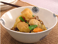 「肉じゃが」のもう一つの主役は、じゃがいもです。みなさんよくご存知のじゃがいもには、さまざまな種類があって、大きく分けて「男爵薯」に代表される粉質と、「メークイン」に代表される粘質がありますが、どちらを使うかは好みです。「ちょっと煮くずれていてもホクホクしたじゃがいもがいい」という人は「男爵薯」を、「煮くずれが少なく、シャキッとしたじゃがいもがいい」という人は「メークイン」を選ぶとよいでしょう。これは、「男爵薯」のでんぷん含有量が約15%で「メークイン」のでんぷん含有量が約14.6%と、含まれるでんぷんの量が多いほどホクホク感が強くなるようです。最近よく耳にする「キタアカリ」には約17%、「インカのめざめ」には約18%もでんぷんが含まれているため、「ホクホク」が好きな方にはおすすめです。