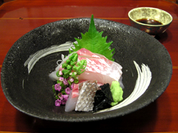 さて、「刺身」とは、魚介類を生で食べる料理で、日本独特の代表的な調理法です。昔は魚介類を生で食べるものは「膾(なます)」といい、「刺身」は「造り身(つくりみ)」といって、調理技術上の一方法でしたが、醤油の発達に伴い、「造り身」が主になり「お刺身」を「お造り」と呼ぶようになったとされます。特に関西ではその呼び方が多く、とりわけ祝儀の場合は、身を刺すという言葉を忌み、「造り」の言葉が使われています。