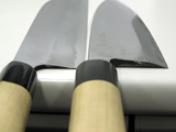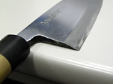 洋包丁のほとんどが両刃で刃先に向かって両面から同じ度合いでなだらかに角度がついているのに対し、和の包丁は片刃で、「しのぎ」と呼ばれる部分から角度がついています。右の写真を見てください。刃の下の面はまっすぐですが、上側には角度がついている部分があります。この角の境の部分をしのぎといいます。しのぎから刃先までの角度があるから、和の出刃包丁は魚をおろすのに最適なのです。和出刃は、魚をおろすとき、刃をねかせたままでは、水平に切っているつもりでも、刃がだんだん上向きになり、骨に身を残しすぎてしまいます。このため、魚と並行ではなく少し立てて使います。こうして微妙に角度をつけて包丁を中骨に沿わせるのに、角度のある和出刃を使うと、とても楽におろせます。ぜひとも家庭にも、ステンレス製の小ぶりの和出刃で結構ですから、購入されることをおすすめします。