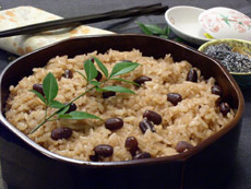 今回紹介する「赤飯」は、小豆のゆで汁で着色したもち米を蒸し上げたものである。古くから赤い色には邪気を祓う力があるとされ、古代米のひとつとされる赤米を蒸し、神にお供えとして奉げ、後にお下がりとして食していたようである。ところが、稲の品種改良により、現在我々が食している、作りやすくて収穫の多い白い米作りが主流になり、小豆などのゆで汁で赤く染めるようになったらしい。今では「赤飯」は誕生日などの祝い事の日に食べられるが、古くは悪いことがあったときに「赤飯」を食し、その赤い色で邪気をはらい、良いことが起こるように願っていたようである。