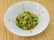 と、ここまでは枝豆をゆでて食べることを主にお話しましたが、枝豆料理については触れていません。枝豆は、季節感を感じられ、歯ごたえがあり、香りと旨みがあって用途の広い豆です。かき揚げにしたり、すりつぶして和え物の衣にしたり、葛粉で練って枝豆豆腐にしたり、白身魚のすり身と混ぜて真薯にしたりと、利用範囲がとても広い食材です。 個人的に好きな枝豆料理は「枝豆のじゃこ炒め」です。作り方はいたって簡単!まず、ゆでた枝豆を莢から取り出しておきます。フライパンに少量の油を入れてなじませ、ちりめんじゃこを炒めます。香ばしくなったところに枝豆を入れて手早く炒め、少量の調味料で味付けします。これだけです。もし気に入ったら作ってみてください。今回、松島先生が紹介してくれました。ちなみに小生はこれに少しマヨネーズを混ぜます。抜群にうまいです。隠れマヨラーですね(笑)