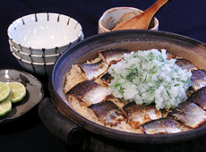 秋刀魚は背の青い魚なので、くせを取るため、土生姜や青紫蘇を使い、さらにさっぱりと仕上げるため、たっぷりの大根おろしを混ぜ、すだちの絞り汁を加えました。