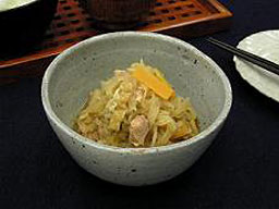 切干大根は煮物にすることが多いが、それ以外に、戻した切り干し大根を三杯酢で和えて、歯ごたえを楽しむ「はりはり」も、さっぱりとして酒の肴によい。 |