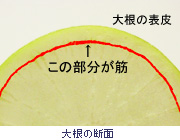 せん切りにして、味噌汁の具材や浅漬けにするのであれば、皮ごと使える。ただ、大根は右の図のように皮の下に筋があるので、煮物にするときは皮をむかないと、この筋が口に残ってしまう。そのため、厚めに皮をむいて使うことが大切である。むいた皮は味噌汁の具材や浅漬け、時にはきんぴらにも美味しく使うことができる。