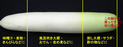 葉付きのいわゆる青首の部分は、みずみずしく甘味もあるので大根卸しやサラダ、酢の物、和え物などの生食に向く。中央部分は辛味が少なく柔らかいので、風呂吹き大根やおでん、含め煮などの煮物に向く。根の先の部分は辛味が強くやや筋っぽいので、細かく切って味噌汁や漬物、きんぴらなどに向く。 |