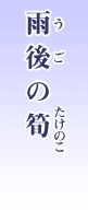 竹の語源は丈(たけ)、高(たか)であるとされていて、筍は竹の地下茎から伸びた若い茎で「竹の子供」という意味である。 |