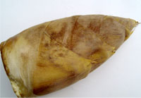 | 全国的にも良質の筍の産地として認知されている京都の筍の中でも、「白子(しろこ)」と呼ばれる、1kg5千円もする高級筍がある。「白子」は皮が白っぽい黄金色で、穂先は黄色く柔らかで、中身はやや透明感のある白色、肉質は柔らかく甘みがある。同じ竹林で採れても、一般的な黒っぽい皮の「黒子(くろこ)」と呼ばれる筍が1kg千円ぐらいで売られているから、その品質の違いは想像がつくだろう。「白子」と「黒子」には明確な基準はないが、同じ竹林でもより粘質でほどよく湿った土に、より白い筍ができるようだ。 |