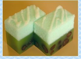「天津風(あまつかぜ)」とは、「空を吹く風」、「空の風」のことで、「雲のかよひぢ」とは「雲間の道」のことです。雲間の道をかるかん生地で表現し、夏の深緑を羊羹で抽象的に表わしました。