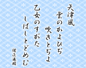 この歌は、作者が出家する前に作った歌です。古今集という歌集にも取り上げられていて、歌の解説とでもいうべき詞書(ことばがき)から、五節の舞に際しての歌だと分かります。旧暦11月に行われる新嘗祭(にいなめさい)の翌日、豊明節会(とよのあかりのせちえ)という行事が行われ、その時の催しが五節の舞です。地位の高い家の娘が五人選ばれて舞姫となります。この時代、貴族の間では、男性が女性の顔を見る機会はほとんどなかったので、美しい娘達の華やかな舞に心を奪われたのでしょう。五節の舞の起源を踏まえ、舞い終わってその場を去る娘達を天上に帰って行く天女に見立て歌ったものです。