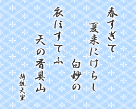 ちなみに、百人一首かるたでは、通例十二単(じゅうにひとえ)の姿で描かれていますが、持統天皇は奈良時代以前の人。十二単は平安時代の装束なので、彼女が生きていた時代には、まだ存在しませんでした。百人一首がかるたとして普及するときに、十二単の姿で描かれてしまったため、それが今に伝わっているのです。