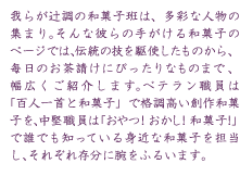 「『古典』と『和菓子』だって?もう、いや!」と逃げ出さないでください。想像とおいしさとちょっぴり恋の世界を味わって頂きたいだけですから。百人一首の和歌を読んで私たちなりに解釈し、イメージを膨らませて作ったのがここにご紹介するお菓子です。和菓子の世界には、和歌や物語を元にして想像力を働かせ、作品に表現するという楽しさや遊びがあるのです。このページを通して、日本の良さを見直して頂けたらうれしく思います。