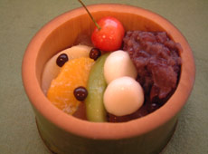 | 立嶋: 「まず、海草である天草を煮詰めて作るトコロテンは、昔中国から遣唐使によって伝えられたそうです。で、寒天ができたのは江戸時代。京都の旅館でトコロテンの残りを、寒い冬、外に捨てたそうです。数日後、見てみると、水分のない干物状態になっていたそうで、それを旅館主の太郎左衛門がもう一度水で煮てみたら、また固まった。これが寒天の始まり。」 |