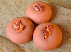 | 加納: 「まず、生地にココアとチョコレート、餡には練乳練り込んで、さらに刻んだチョコも入れて……っと。甘い餡とビターなチョコってのが相性いいんだよねぇ。」 |