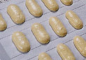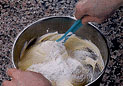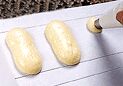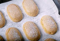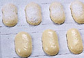 粉砂糖を2回に分けて振る。1度目は軽く振りこれが溶けたら2度目の粉砂糖を振る。あらかじめ温めておいたオーブンプレートにのせ、180度のオーブンで約12〜15分で焼き上げる。