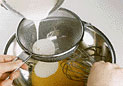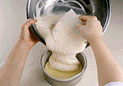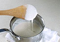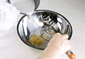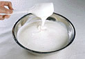 温めた牛乳と生クリームをすりおろろしたチーズの中に少しずつ加える。