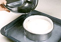 オーブンプレートに布巾を敷いて方を置き、湯を張る(オーブンの前で準備し、静かに入れる)。160℃のオーブンで焼く。