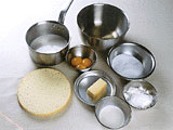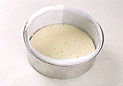 8x60cmの紙の帯に溶かしバターを塗り、型に貼り付ける。スポンジ生地を作って、1cm厚さにスライスして型に入れておく。ゴーダ・チーズはすり下ろしてしておく。牛乳と生クリームは合わせて湯煎で温めておく。