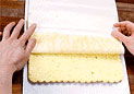 焼き上がって熱のとれたビスキュイ生地を紙の上に裏返し、紙を滑らせるようにそっとはがす。