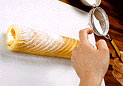 下に敷いておいた紙を持ち上げるようにして巻いていく。(巻きずしの要領で)
