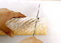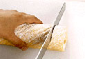 水分をふき取り、包丁を向こう側にすべらせる様にしながら切る。