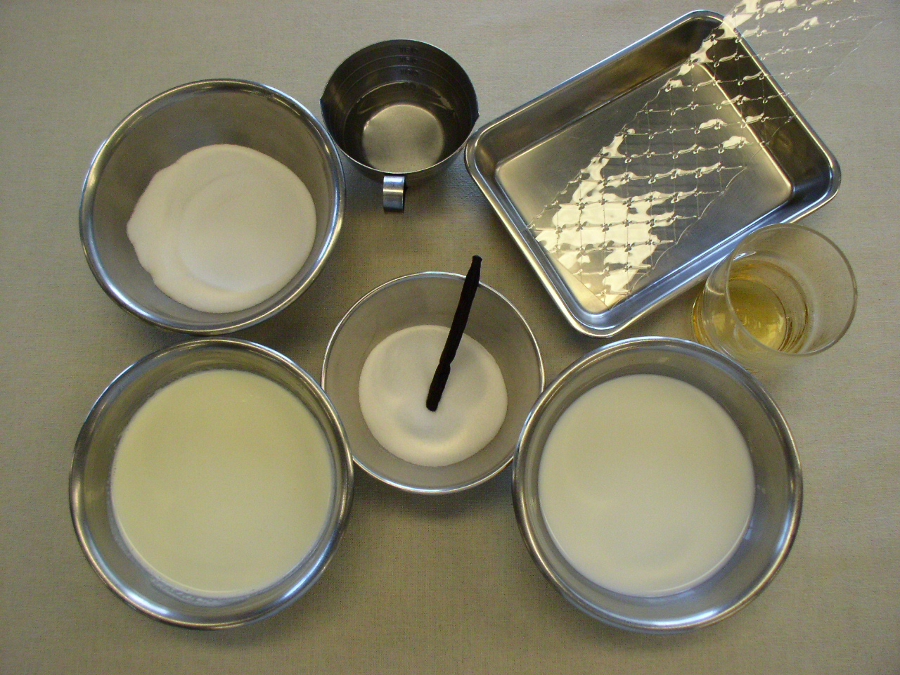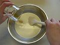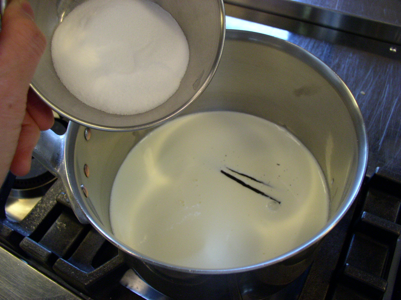 生クリームと牛乳にバニラのさやと砂糖を入れ、沸騰させる。