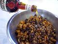 干しぶどうとオレンジピールを混ぜ、お酒に漬ける。