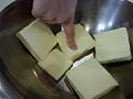 バターを混ぜやすい固さに調節するため1cm厚さに切り、ボウルに貼り付け室温においておく。