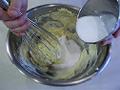 砂糖が混ざったら、卵黄も加えて混ぜる。さらに塩、バニラエッセンスを加える。