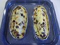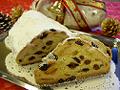 干しぶどうは湯で戻し、オレンジピールは水で洗ったものを1cm角に切る。ラム酒漬けのレーズンにオレンジピール、レモンピールを加えてもよい。